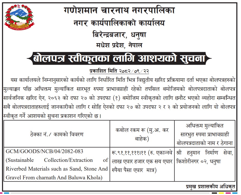 वोलपत्र स्विकृतिका लागि आशयको सूचना !